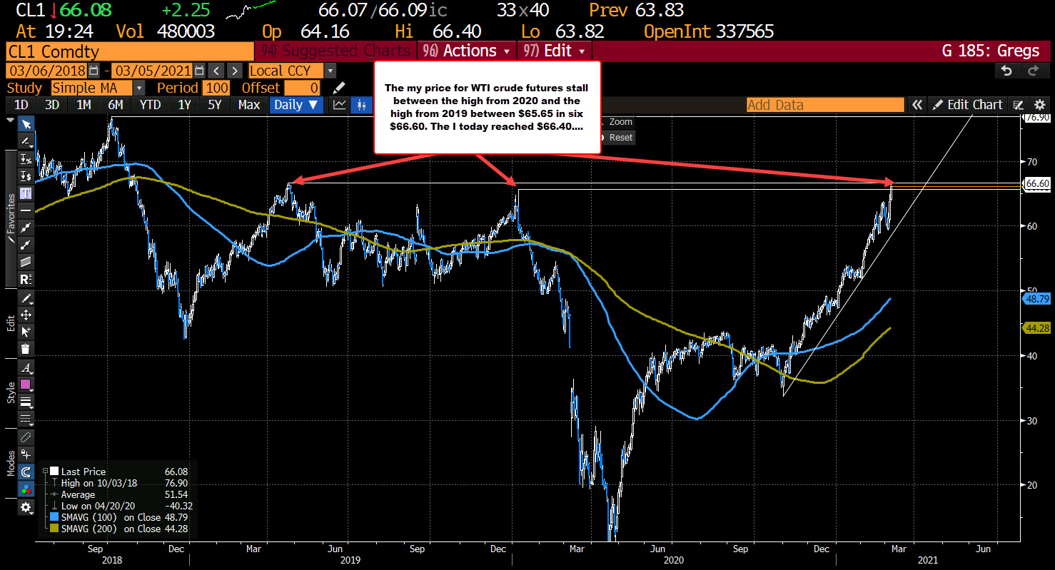 Looking at the daily charts, the high price extended above the high from January 2020 (on a continuous active contract chart) at $65.65, but stalled just ahead of the 2019 high price at $66.60.. Getting above the 2019 high is needed to solicit more buying. Having said that there is good reason for traders to lean against the level as risk can be defined and limited.